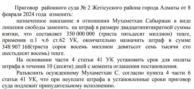 - Сабыржан Мухаметхан – признать виновным по пункту 2 части 3 статьи 367 УК РК "Дача взятки". Назначить шесть лет лишения свободы.