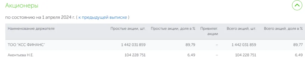 Акционерами банка выступают ТОО "КСС ФИНАНС" (принадлежит 89,77%, структура входит в активы Владимира Кима) и Наталья Акентьева (6,49%). В этом году руководство ещё не встречалось для распределения прибыли и решения по дивидендам.