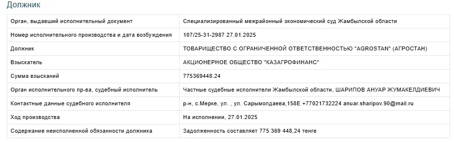 Когда госкомпания не получила назад свои вложения, она пошла в суд. Ответчикам присудили выплатить основной долг – 597 512 255 тенге, вознаграждение – 166 407 415,92 тенге, неустойка – 11 449 777,32 тенге. Решение вступило в законную силу в декабре 2024 года.