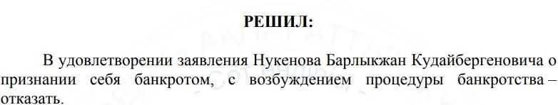 Имея столь внушительные долги, в 2024 году бывший ТОП-менеджер Казкоммерцбанка попытался получить статус банкрота. Барлыкжан Нукенов заявлял в суде, что неплатежеспособен, поэтому "у него отсутствует объективная возможность