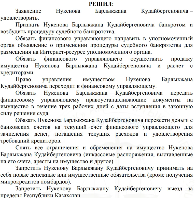 Мужчину это не остановило. Его всё-таки объявили банкротом, но уже в марте 2025 года. Сделал это Бостандыкский районный суд Алматы. Помимо снятия всех ограничений и обременения на имущество, Нукенов пришлось передать все деньги банкротному управляющему. Ему также запретили выезд за пределы Казахстана.