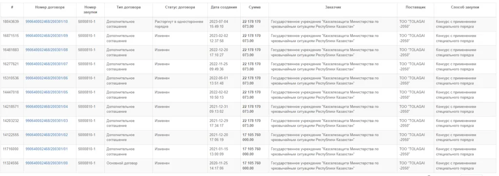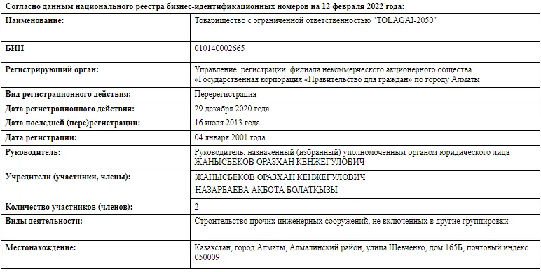 ТОО "TOLAGAI-2050" в ноябре 2020 года заключило основной договор с "Казселезащитой" МЧС РК на "строительно-монтажные работы объекта и строительство селезадерживающей плотины в бассейне реки Аксай". Стоимость работ оценили в 17,1 млрд тенге. Конкурс компания выиграла с применением специального порядка.