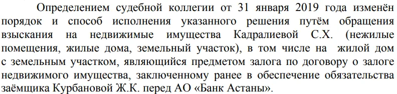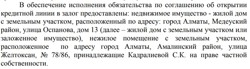 Оказалось, что история с изъятой недвижимостью длится уже давно. Ещё в декабре 2014 года Жанат Курбанова взяла в АО «Банк Астана-финанс» (лишён лицензии) кредит на 3,9 млн долларов и погасить она должна была его до 18 декабря 2015 года. В мае того же года стороны увеличили лимит до пяти млн долларов. А в качестве залога Жанат Курбанова предложила как раз две недвижимых имущества, принадлежавшие Светлане Кадралиевой.