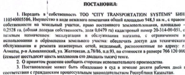 Остаётся загадкой, как компания могла получить в пользование дом на весьма дорогостоящем участке земли, чья себестоимость оценивалась в 845,9 млн тенге.