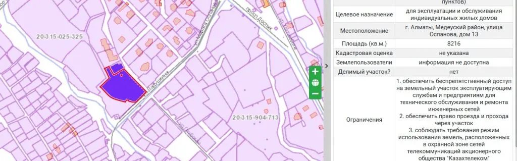 Как выяснил отдел расследований CMN.KZ, адрес дома сменил название на Керей и Жанибек хандар, 13. У обоих участков в Медеуском районе есть ряд ограничений: