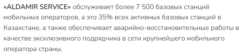 Отметим, что на официальном сайте ТОО "АЛЬДАМИР-СЕРВИС" указано, что компания обслуживает системы кондиционирования. Организация также предоставляет услуги в проектно-изыскательской, строительно-монтажной сферах и обслуживает системы телекоммуникаций и электропитания, а также специализированного оборудования.