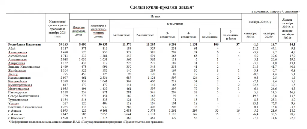 «По сравнению с сентябрём 2024 года (39 543) количество сделок купли-продажи жилья уменьшилось на 1%. Лидерами остаются Алматы – 7 642 (19,5%) и Астана – 6 993 (17,9%), а также Карагандинская область – 2 997 (7,7%). Меньше всего сделок провели в области Улытау – 527 сделок (1,3%)».