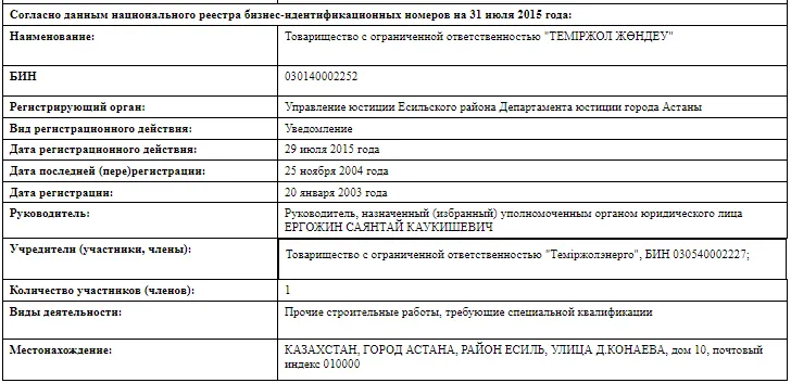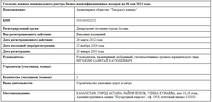 Что до ТОО «Теміржол жөндеу», то там долгое время были скрыты имена учредителей. Значилось двое, но кто они, не раскрывалось. Лишь в мае 2013 года в Egov.kz секрет перестал быть таковым: в списке учредителей к ТОО "Теміржолэнерго" присоединилось КТЖ.