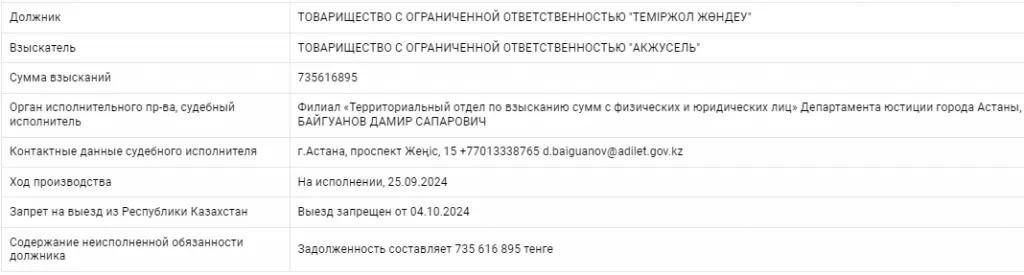 Однако в судебном кабинете у ТОО «Теміржол жөндеу» всё не настолько успешно. Они должны более 735 млн тенге по решению Межрайонного суда по гражданским делам Шымкента. Взыскателем выступает ТОО "АКЖУСЕЛЬ".