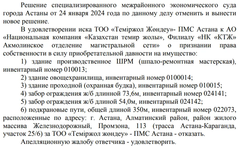 Специализированный межрайонный экономический суд города Астана удовлетворил иск ТОО. Но в апелляционной инстанции не согласились с такими выводами. Там объяснили, что представители «Теміржол жөндеу» знали, что спорные объекты принадлежат АО «НК «ҚТЖ» – «Акмолинское отделение магистральной сети», но продолжали пользоваться. 20 марта компании Кулибаева отказали в удовлетворении апелляционной жалобы.