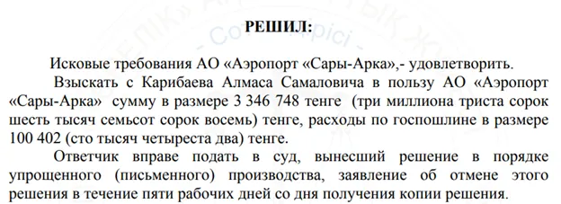 12 июля 2019 года Бостандыкский районный суд Алматы встал на сторону истца и потребовал взыскать с владельца воздушного судна долг.