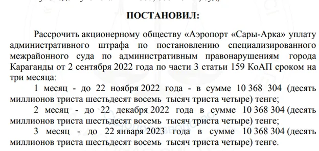 В конце октября представители аэропорта попросили рассрочку на три месяца – по 10,3 млн тенге. Иск им удовлетворили.