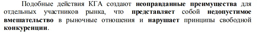 Проблема, по мнению прокуратуры, не только в том, что действия КГА незаконны, но и в том, что это создаёт неоправданные преимущества для отдельных участников рынка.
