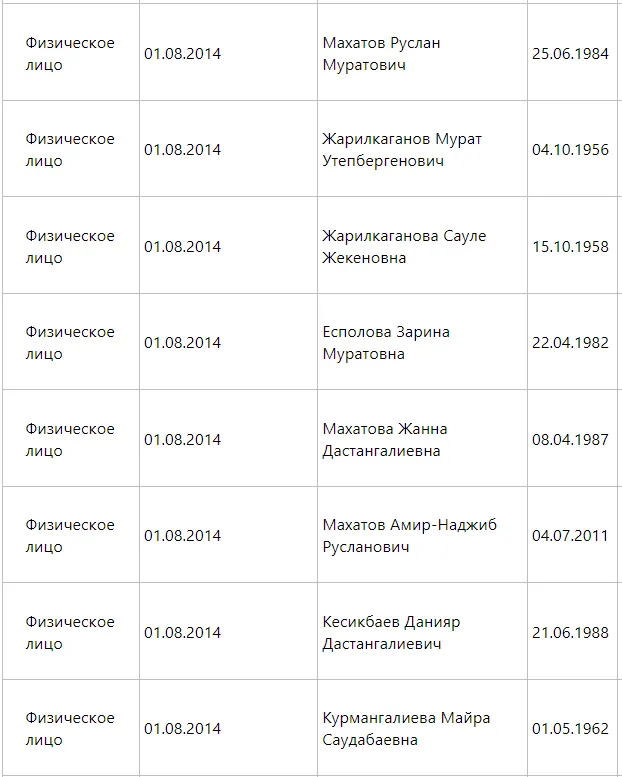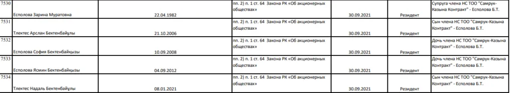 Согласно другому списку аффилированных лиц, Зарина Есполова, предположительно, приходится дочкой Мурату и Сауле Жарилкагановым, а Руслану Махатову – сестрой.