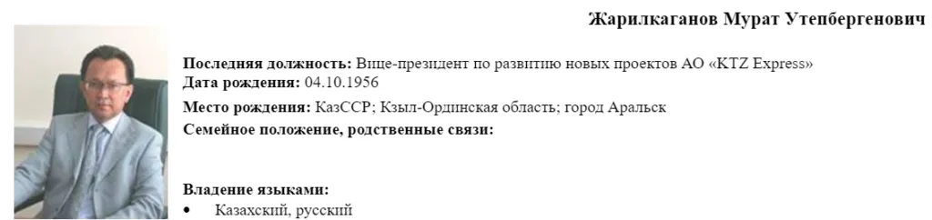Мурат Жарилкаганов значится главным инженером и вице-президентом по развитию новых проектов АО «KTZ Express». Он также был в совете директоров АО «Управляющая компания специальной экономической зоны «МЦПС «Хоргос» в июле 2017 года.