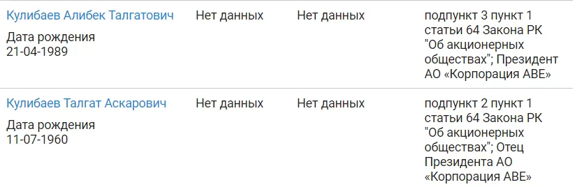 А вот родственники Тимура Кулибаева до сих пор руководят компаниями. Его племянник Алибек Кулибаев значится президентом «Корпорации АВЕ», а брат Талгат Кулибаев занимает должность председателя совета директоров корпорации.