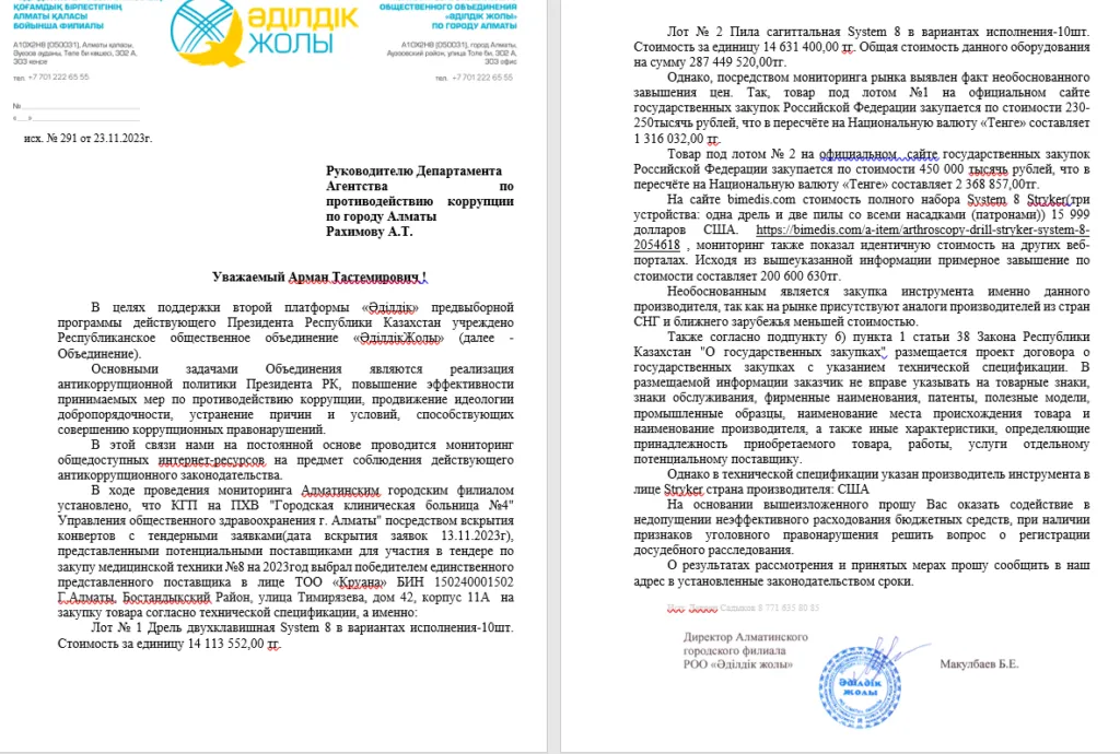 В Алматинском филиале «Әділдік жолы» описали схему. К концу 2023 года коммунальному государственному учреждению на праве хозяйственного ведения «Городская клиническая больница №4» понадобились несколько механизмов. Исходя из технической спецификации закупки, больнице от конкретной фирмы были нужны: