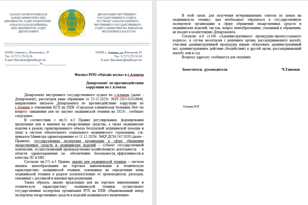 В ответе департамента внутреннего государственного аудита говорится, что анализом предельных цен занимается занимается лишь одна госорганизация. Это «Национальный центр экспертизы лекарственных средств и изделий медицинского назначения», находящийся в подчинении министерства здравоохранения.