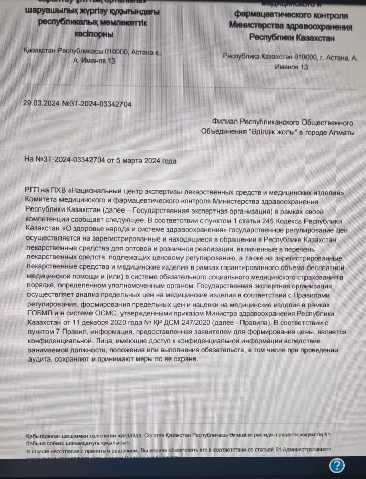Директор филиала «Әділдік жолы» в этой связи направил вопросы министру здравоохранения:
