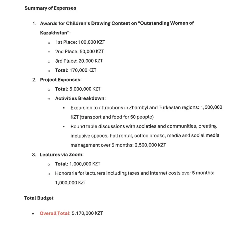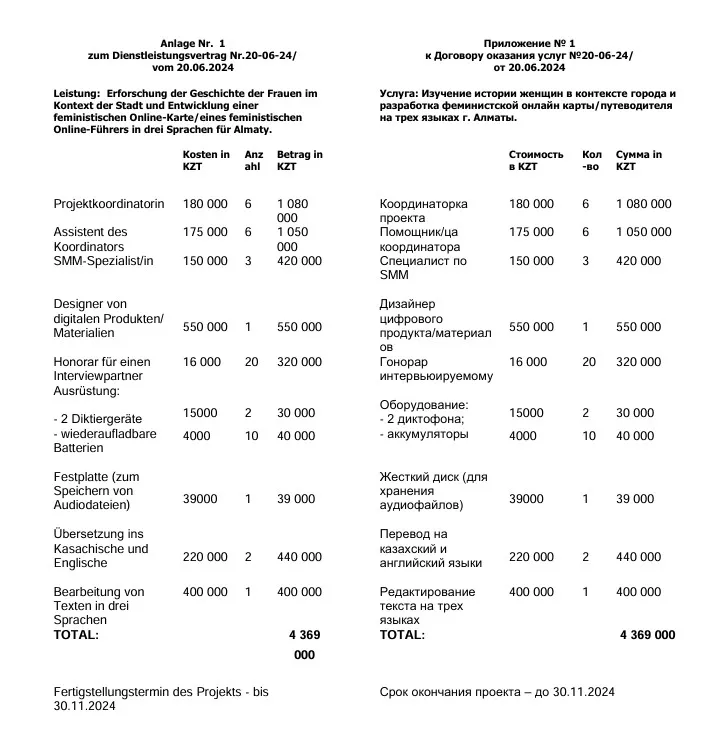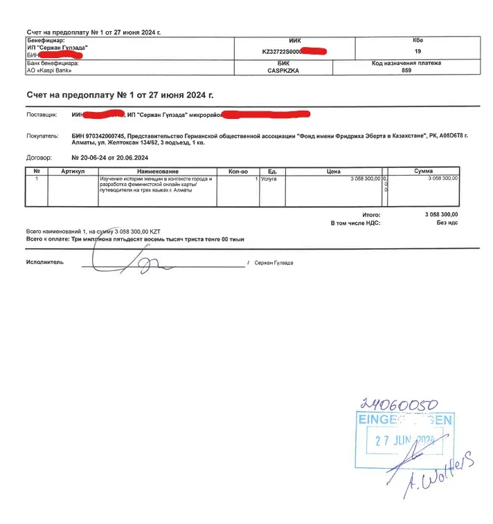 Стороны сначала сошлись на 5 170 000 тенге. Затем согласовали договор оказания услуг на 4 369 000. Однако счёт на оплату, во-первых, выставили другому лидеру фем-движения Гульзаде Сержан. Во-вторых, сумма уменьшилась до 3 058 300 тенге.