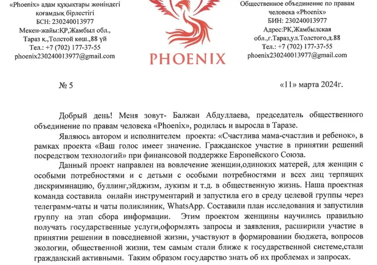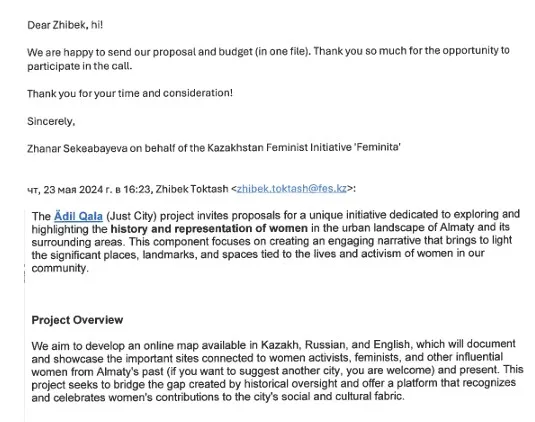 За два месяца до описанных выше событий руководитель общественного объединения по правам человека Phoenix Балжан Абдуллаева и руководитель отдела коммуникаций в Фонде Фридриха Эберта в Казахстане Жибек Токташ связались по почте с упомянутой ранее Жанар Секербаевой. В письме говорится о предложении реализовать проект, бюджете и чётком на него ТЗ.