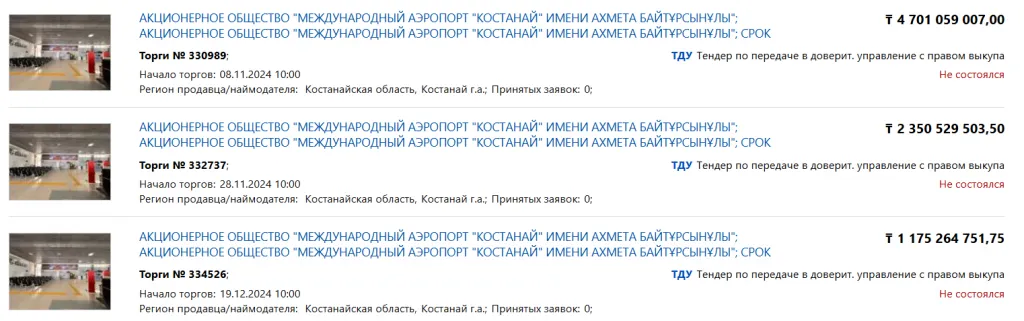 Международный аэропорт Костаная имени Ахмета Байтурсынова выставляли для передачи в доверительное управление три раза. Срок аренды должен был составлять пять лет с правом последующего выкупа. И все три раза аукцион не состоялся, потому что не нашлось желающих. И это несмотря на то, что допускалась его передача даже при наличии одной заявки. Так, стоимость передачи 100% акций снизилась с 4,7 млрд тенге до 1,1 млрд тенге.