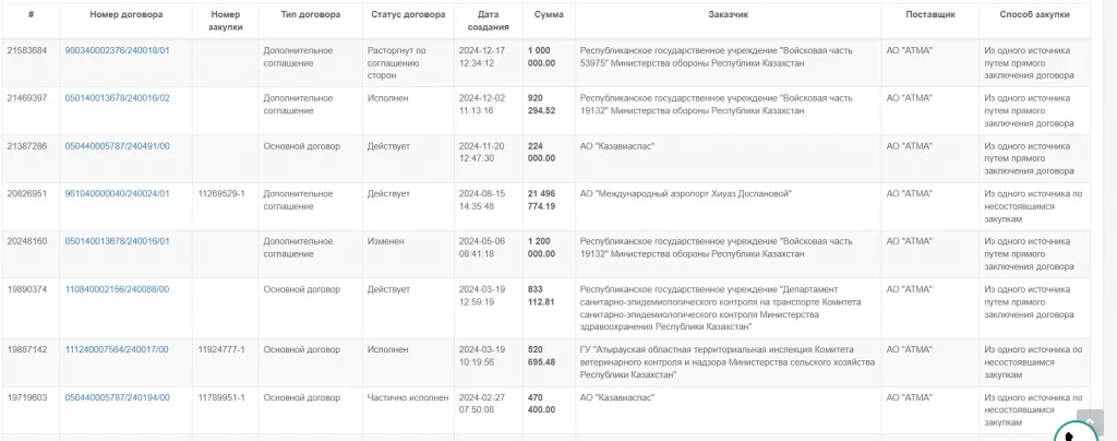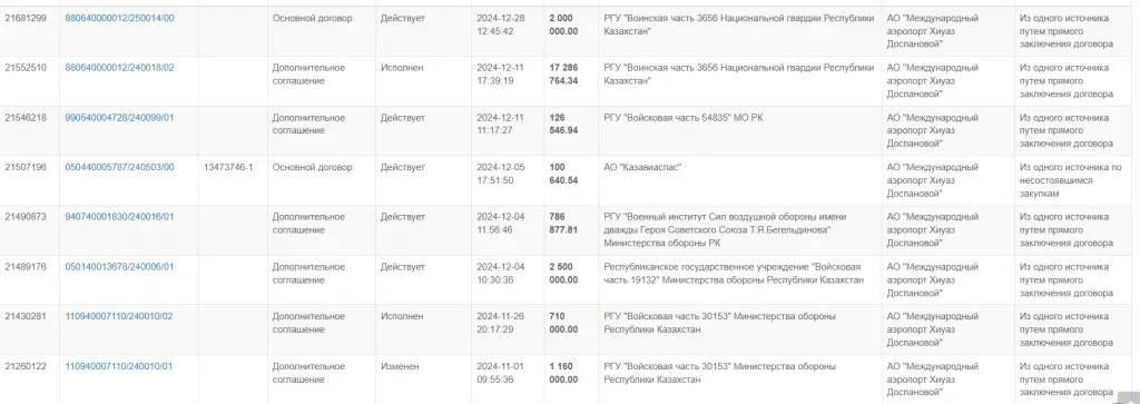 Как это не странно, принадлежащее государству АО "Международный аэропорт Атырау" имени Хиуаз Доспановой", как и АО «АТМА – Аэропорт Атырау и перевозки», регулярно участвует в госзакупках. И тоже в качестве поставщика услуг по обслуживанию воздушных судов. Среди заказчиков значится АО "Казавиаспас", войсковые части и Военный институт Сил воздушной обороны имени дважды Героя Советского Союза Талгата Бегельдинова.