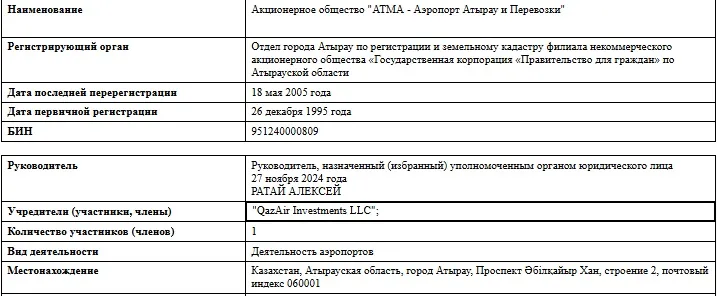 Дело в том, что на официальном сайте аэропорта они указаны как АО "Международный аэропорт Атырау" имени Хиуаз Доспановой" (учредитель Управление по государственным закупкам и коммунальной собственности Атырауской области), а в документе правительства – АО "АТМА – Аэропорт Атырау и Перевозки". Именно вторую компанию в итоге и продали катарскому предприятию.