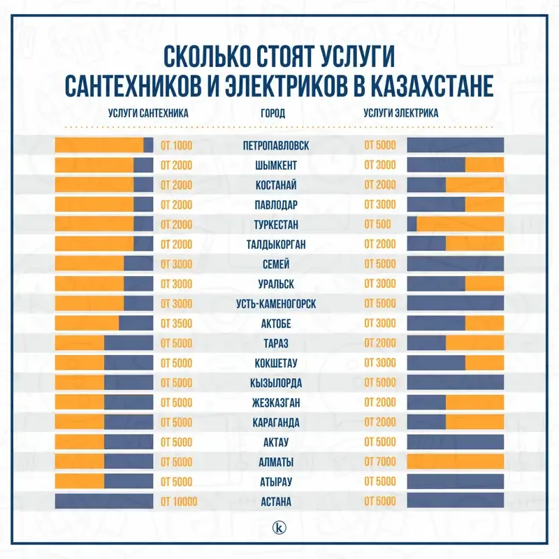 По версии издания, электрики в Казахстане дешевле сантехников. За просто посмотреть они берут от 500 тенге. А в Туркестане за такую сумму еще и могут поменять розетку. К примеру, в Талдыкоргане, Таразе, Костанае, Караганде и Жезказгане услуги специалиста начинаются от 2 000 тенге. В Павлодаре, Кокшетау, Шымкенте, Актобе, Петропавловске и Уральске стоимость вызова начинается от 3 000 тенге. Впрочем, за вызов некоторые могут не предъявлять, если им дадут работу и ее оплатят.