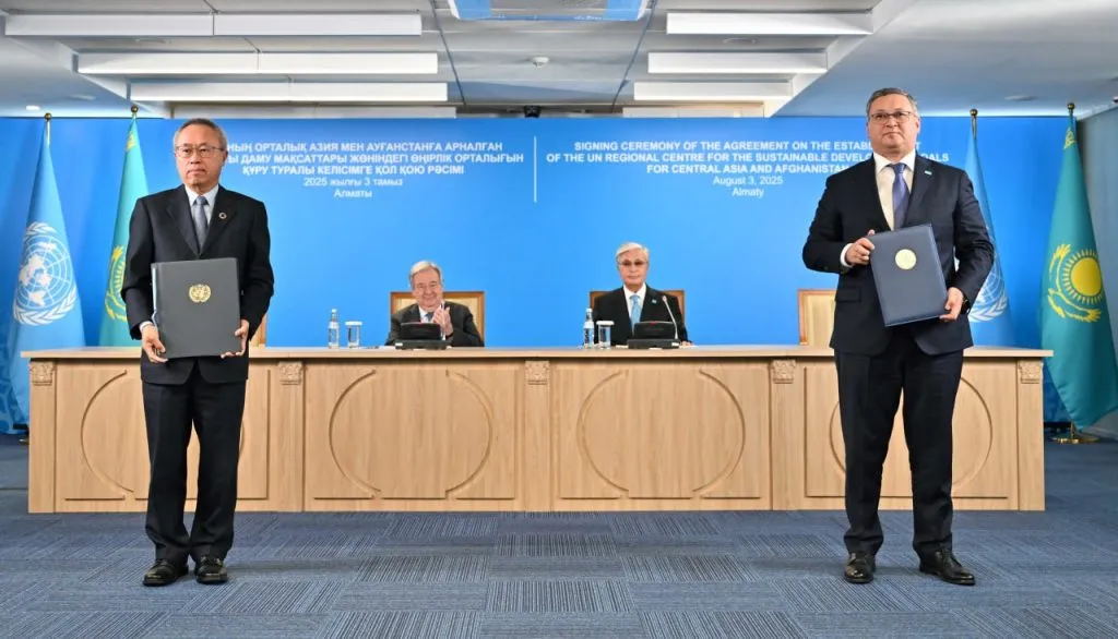 Также глава государства и Генеральный секретарь ООН приняли участие в церемонии подписания Соглашения между правительством Казахстана и ООН о создании Регионального центра ООН по целям в области устойчивого развития для Центральной Азии и Афганистана.
