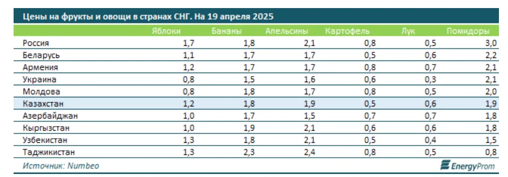 Аналитическое агентство Energyprom.kz провело исследование стоимости фруктов и овощей в Казахстане и других странах СНГ.