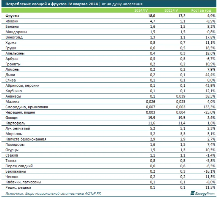 Потребительские предпочтения казахстанцев в конце 2024 года указывают на яблоки как на наиболее популярный фрукт (4,3 кг на душу населения), а картофель (11,6 кг на душу населения) – как на самый востребованный овощ.