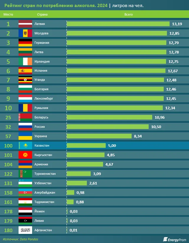 Среди стран СНГ больше алкоголя, чем в Казахстане, потребляют в Беларуси, России и Украине, меньше — в Кыргызстане, Армении, Туркменистане, Узбекистане, Азербайджане и Таджикистане, пишет Еnergyprom.kz.