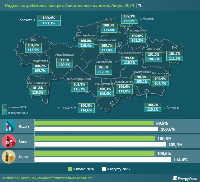За месяц заметнее всего алкоголь подорожал в Астане — на 2,1%, а также в Западно-Казахстанской и Мангистауской областях — на 1,8% в каждом из регионов. При этом в Актюбинской, Карагандинской, Улытауской и Алматинской областях напитки подешевели.