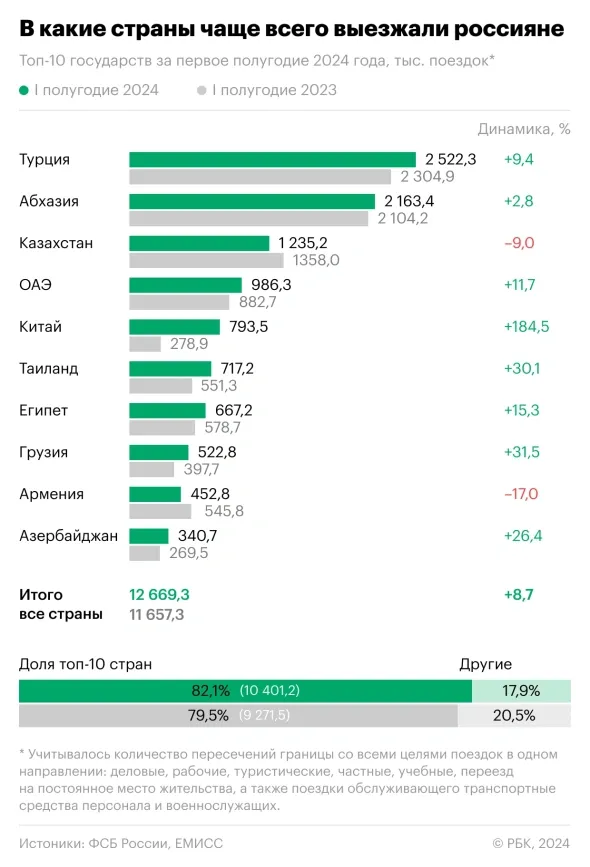 В статистике пограничной службы ФСБ, пишет РБК, учитывается количество пересечений иностранными и российскими гражданами государственной границы, учитывая несколько целей визита. По подсчетам ведомства, россияне чаще всего выезжали в страны ближнего зарубежья: Абхазия, Казахстан, Армения и Грузия.