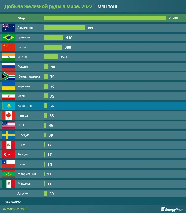 В соседней России добыли 90 млн тонн железной руды. В Казахстане, по данным USGS, объём добычи железной руды за 2022 год составил 66 млн тонн, что позволило РК занять 9-е место в мире по этому показателю.