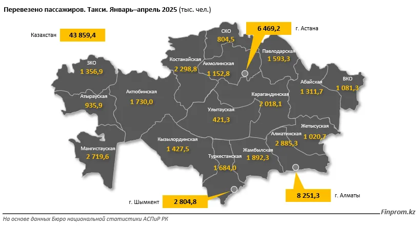 «Чаще всего услугами такси пользовались в Алматы (8,3 млн пассажиров), Астане — (6,5 млн пассажиров) и Алматинской области (2,9 млн пассажиров). Наименьшие показатели зафиксировали в Улытауской, Северо-Казахстанской и Атырауской областях», – заметили аналитики.