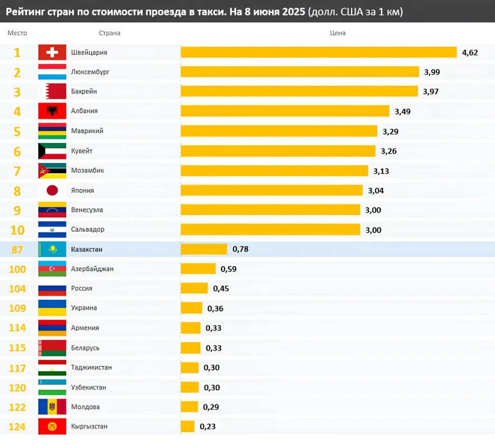 По данным аналитиков Finprom.kz со ссылкой на ресурс Numbeo (на 8 июня 2025 года), средняя цена поездки в такси по Казахстану составляет 0,78 доллара США за километр.