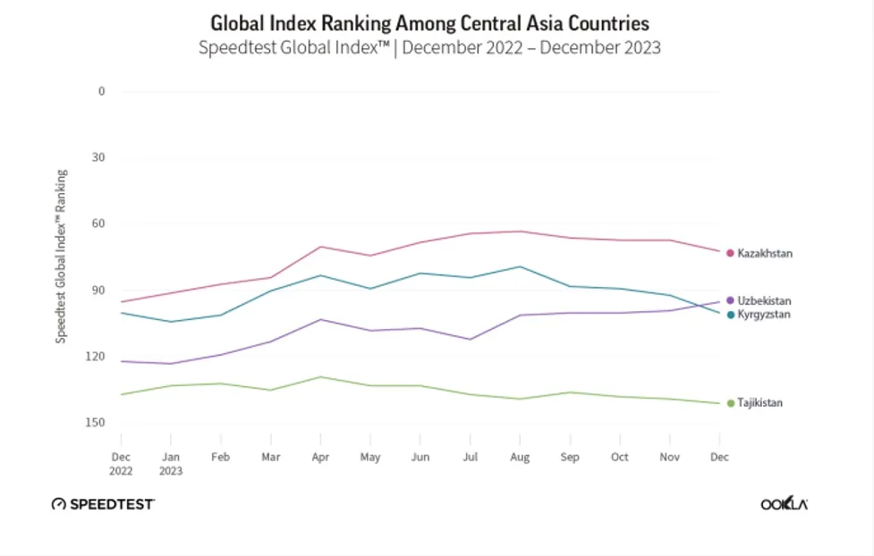 «Казахстан лидирует в Центральной Азии также и по средней скорости загрузки мобильных данных в сети 4G. В четвертом квартале 2023 года медианная скорость загрузки в 4G составила 28,26 Мбит/с, что является самым высоким показателем среди стран Центральной Азии. Это достижение превосходит результаты Узбекистана — 23,09 Мбит/с, Кыргызстана — 26,76 Мбит/с и Таджикистана — 11,15 Мбит/с»,