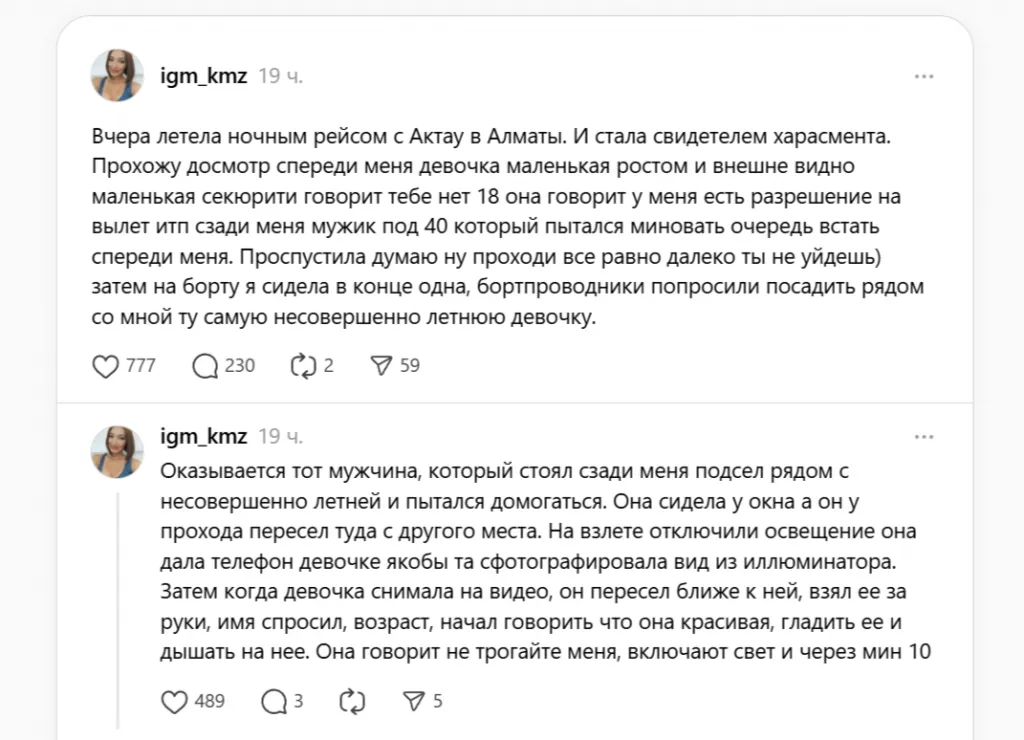 Женщина назвала ситуацию харассментом. История произошла 21 декабря. Ещё при посадке на борт пассажирка обратила внимание на девочку-подростка, которая летела без сопровождения взрослых. Позже к ребёнку подсел мужчина.