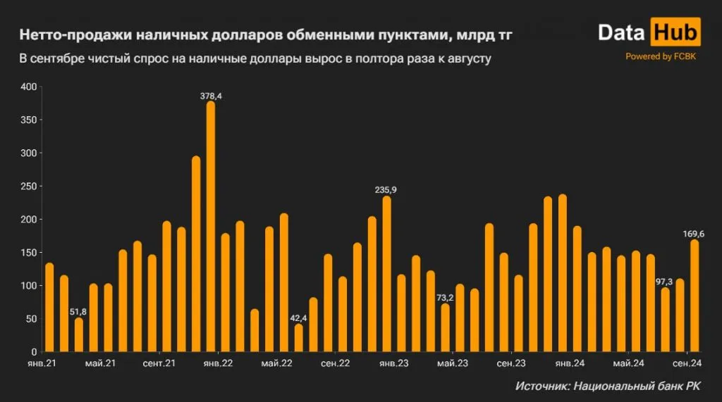 Аналитики Первого кредитного бюро проследили, что в сентябре 2024 года обменники продали на 169,6 млрд тенге больше американской валюты, чем купили. К августу нетто-продажи выросли на 53,3% и оказались на максимуме за восемь месяцев.