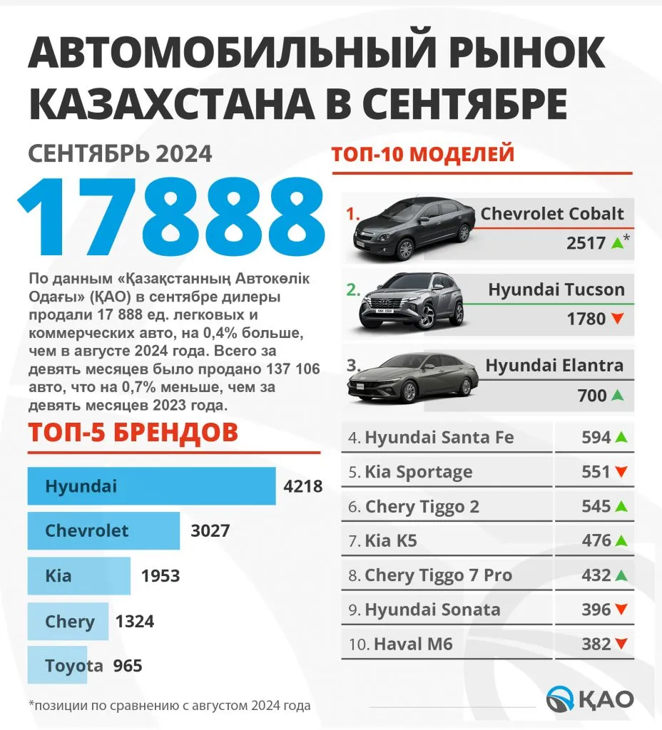 По данным «Казахстанского Автомобильного Союза» по стране в сентябре 2024 года дилеры продали 17 888 новых легковых и коммерческих автомобилей, передаёт CMN.KZ