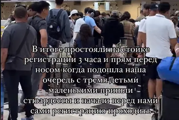 Также её возмутило, что отстояв трехчасовую очередь на регистрацию семье с тремя маленькими детьми, которые уже были измучены, им пришлось пропускать бортпроводников.