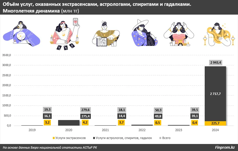 По итогам 2024 года гадалки, экстрасенсы, нумерологи и тарологи отчитались государству об оказании услуг на сумму 2,9 млрд тенге. Это в 75 раз больше, чем за 2023 год, передаёт CMN.KZ