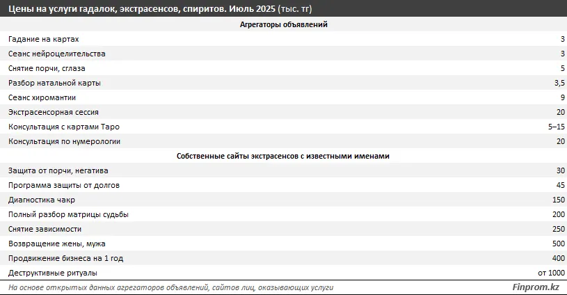 Цены на услуги магов, гадалок и целителей зависят от места публикации объявлений. На платформах-агрегаторах и в социальных сетях они, как правило, дешевле и начинаются от трёх тысяч тенге. В то время как на сайтах, принадлежащих экстрасенсам с громкими именами, стоимость может варьироваться от 30 тысяч до миллиона тенге.