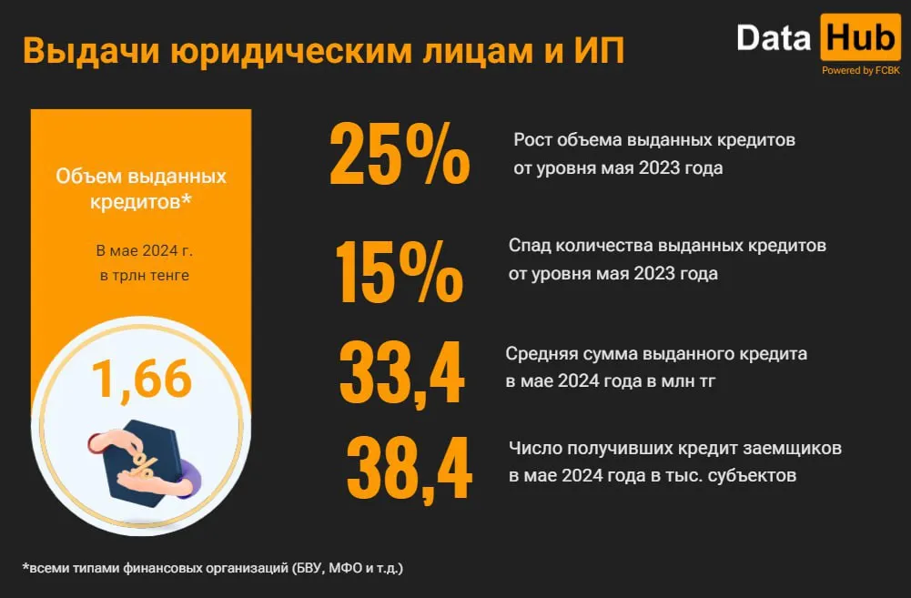 В кредитовании юрлиц и ИП всё с точностью наоборот. В годовом разрезе показатели хорошо растут. Но стоит подчеркнуть, что увеличивается именно сумма выдач. За май она выросла на 25% ( до 1,66 трлн тг.) относительно прошлого года.
