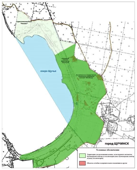"Определить для размещения казино, залов игровых автоматов, букмекерских контор и тотализаторов (касс букмекерских контор и/или тотализаторов) территорию, расположенную в юго-восточной части побережья озера Щучье, в северной, северо-западной части побережья озера Большое Чебачье и вокруг озера Текеколь Бурабайского района Акмолинской области", – указали в документе.