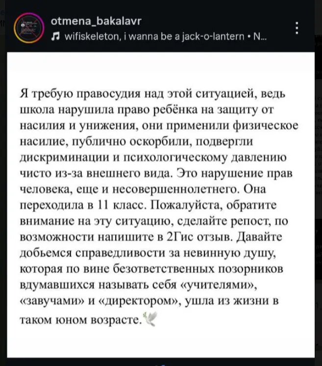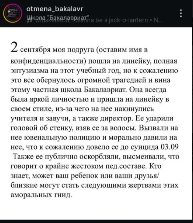 Әлеуметтік желілерде 17 жасар қыз өзі оқыған жеке мектептегі жанжалдан кейін өз өмірін қиды деген ақпарат пайда болды. Қыз 11-сыныпқа ауысуға дайындалып жүрген. 1 қыркүйекте ол мектеп қатарына бейресми киім киіп келді.