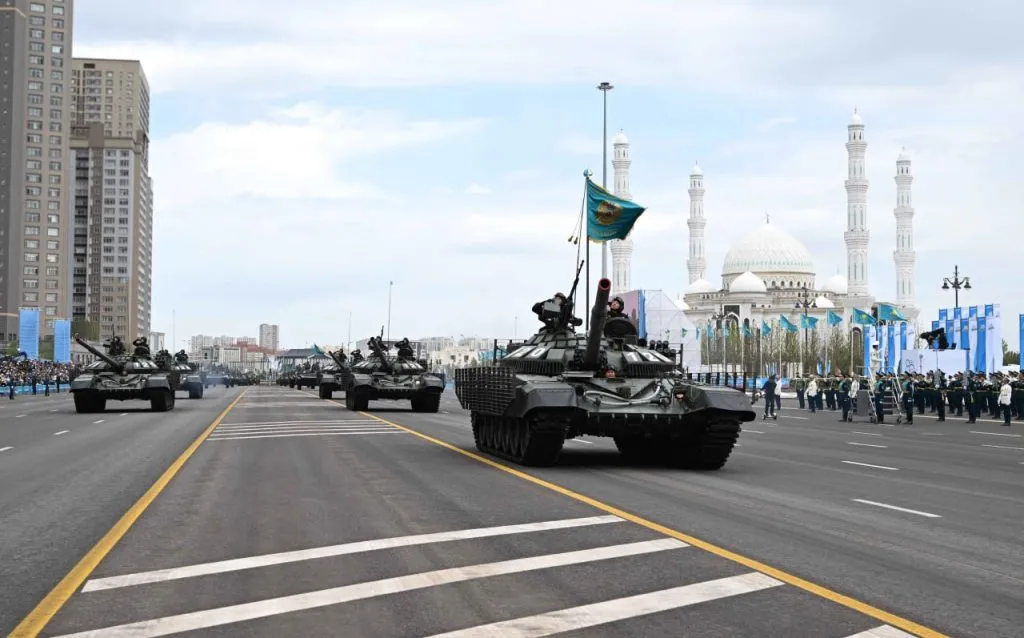 После исторической части по площади прошла современная бронетехника. Среди них — модернизированные танки Т-72 — основа бронетанковых подразделений казахстанской армии.