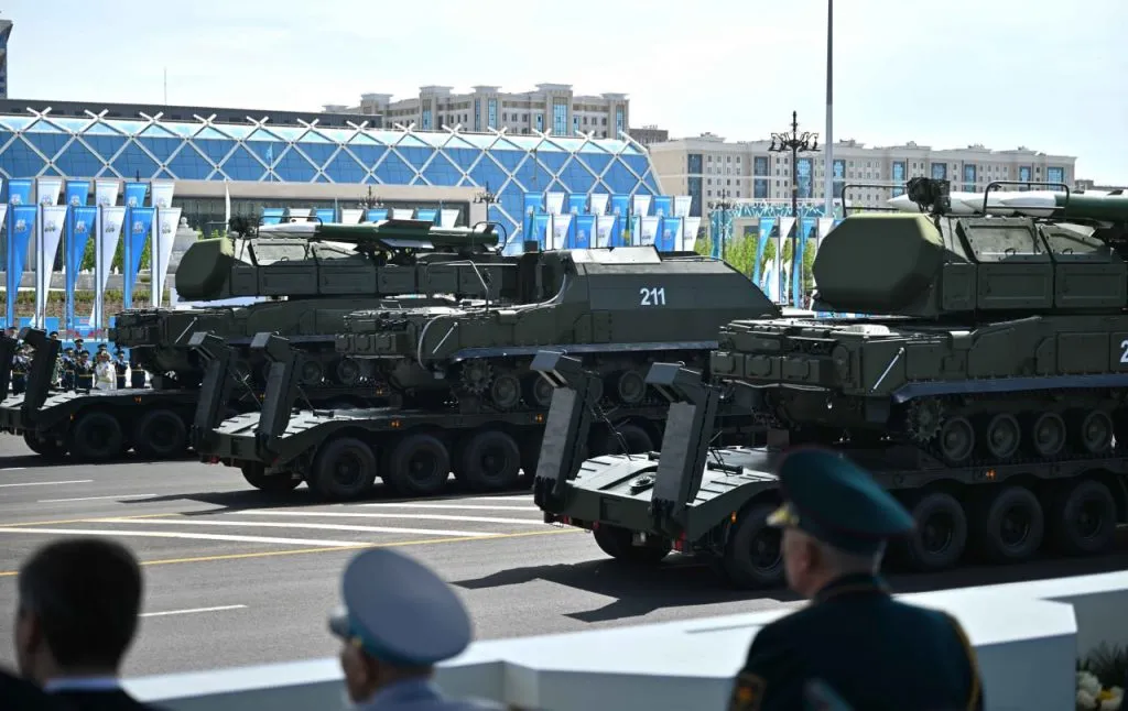 Затем прошли расчёты сил воздушной обороны во главе с генерал-майором Кайратом Даутовым, обладателем медали «Жауынгерлік ерлігі үшін».